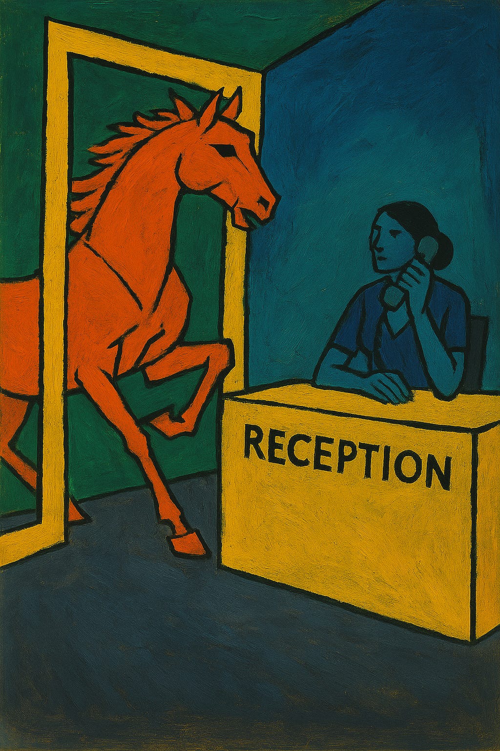 He’s not sick. He’s just ... there. In the lobby. Next to the water cooler. Whinnying gently beside the receptionist who’s pretending this is normal.