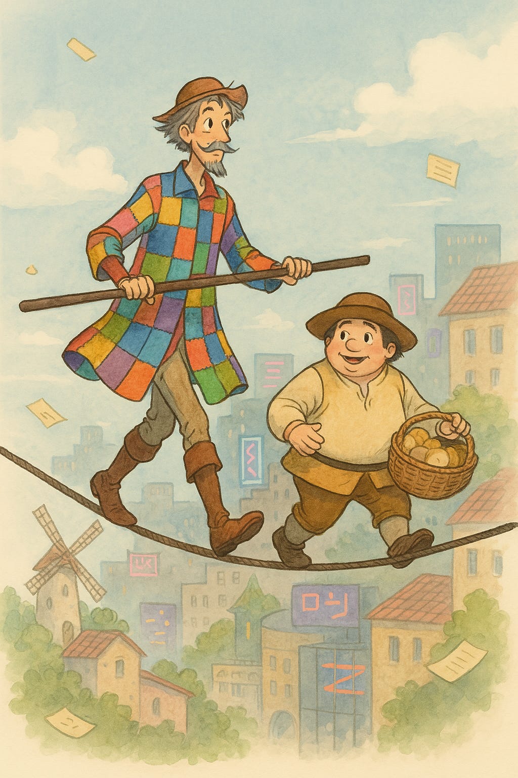 And no one has to walk this tightrope alone. Don Quixote had Sancho. You need someone who carries the basket, tells the truth, and believes in your madness just enough to stay beside you. Someone to remind you that noble quests are better with lunch breaks and eye-rolls.