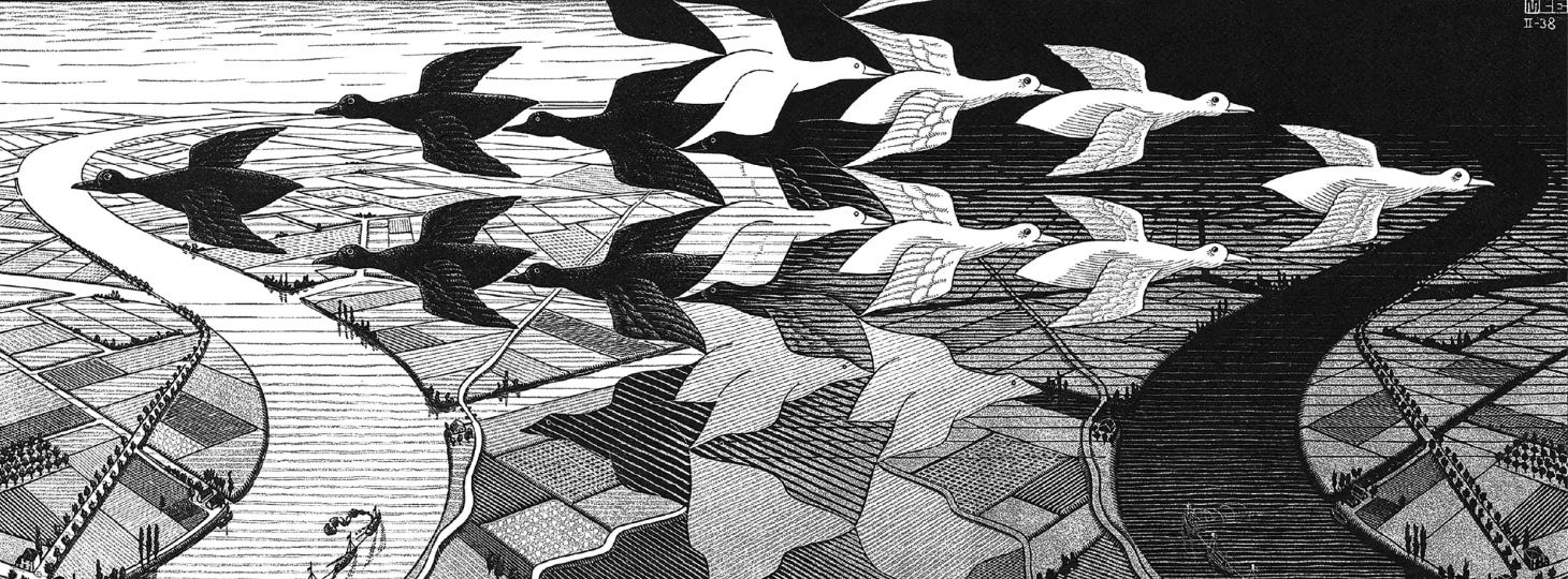 The structure resembles the visual logic of M. C. Escher. In his drawings, shapes reproduce each other endlessly across a surface. A bird becomes a fish, a fish becomes a bird. Each figure exists through repetition of another. Nothing is singular. Everything is pattern.